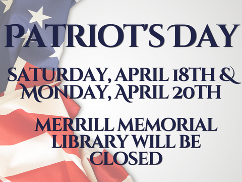 Merrill Memorial Library will be CLOSED Saturday, April 18th and Monday, April 20th for Patriot’s Day.